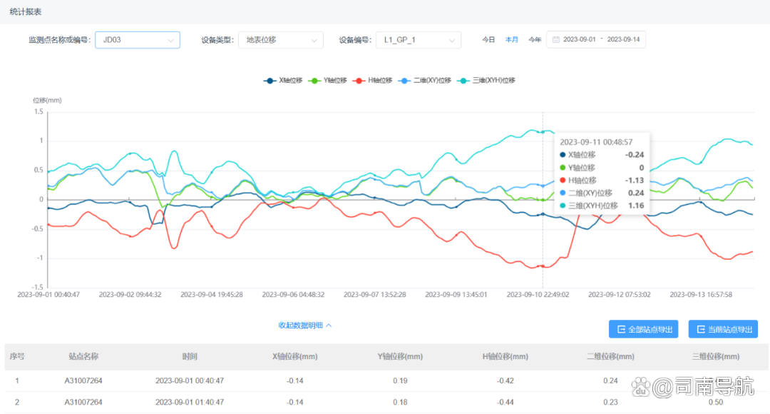 该公路边坡在项目实施的过程中就发生了位移,通过利用司南导航公路边坡监测系统对公路边坡进行监测并通过多系统数据的综合分析,对于及时掌握边坡的失稳区域、滑动面情况,捕捉边坡灾害的特征信息,具有重要的工程意义与社会效益。