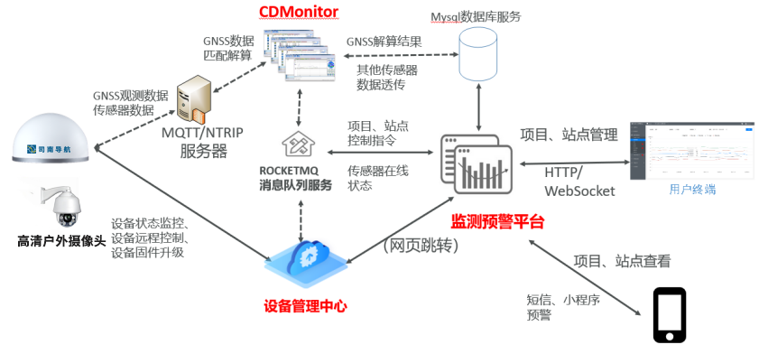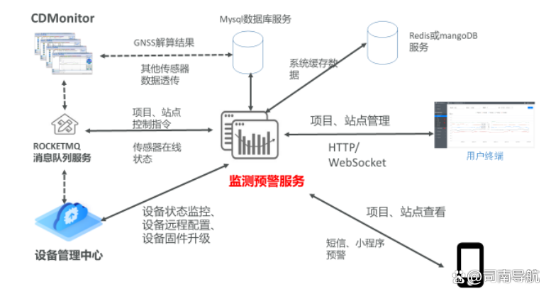 监测系统框架主要涉及的软硬件系统有:传感器、GNSS及传感器解算服务、设备管理中心、监测预警平台、显示终端、其他底层数据服务等各个模块组成。