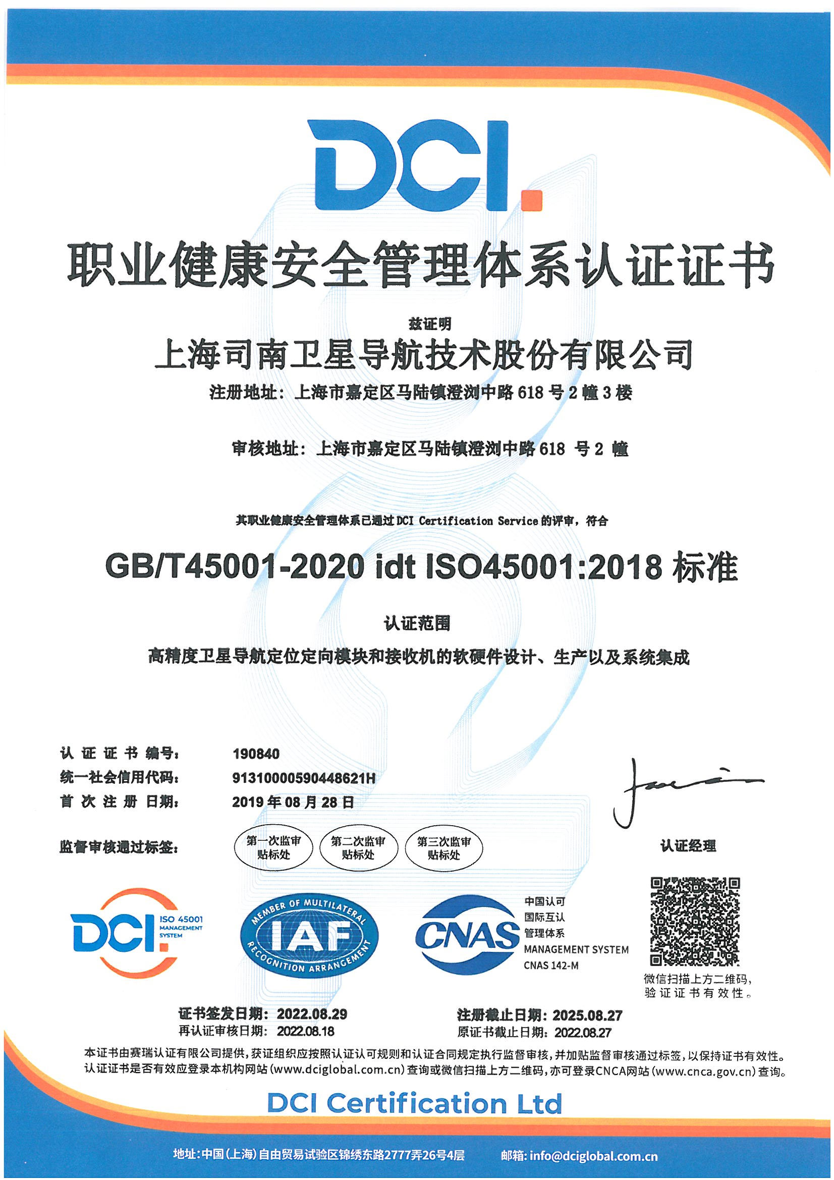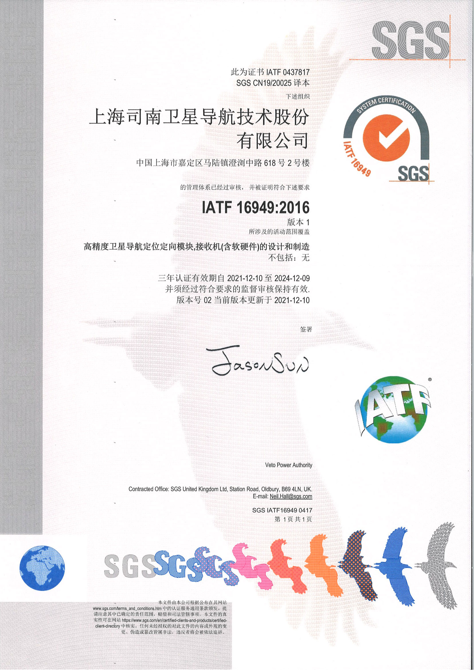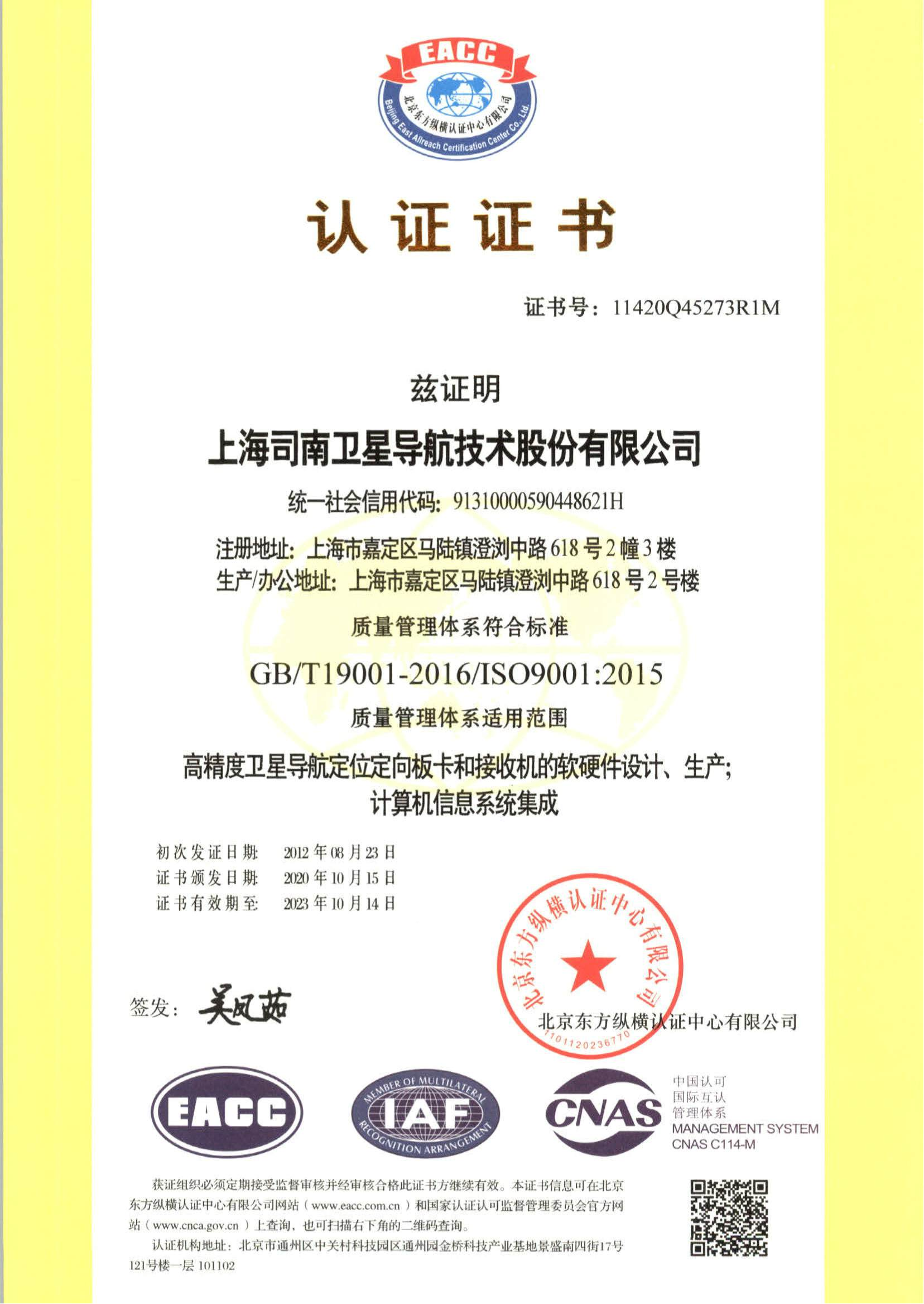 2019年12月司南导航通过了ISO9000:2015、IATF16949质量管理体系监督审核。