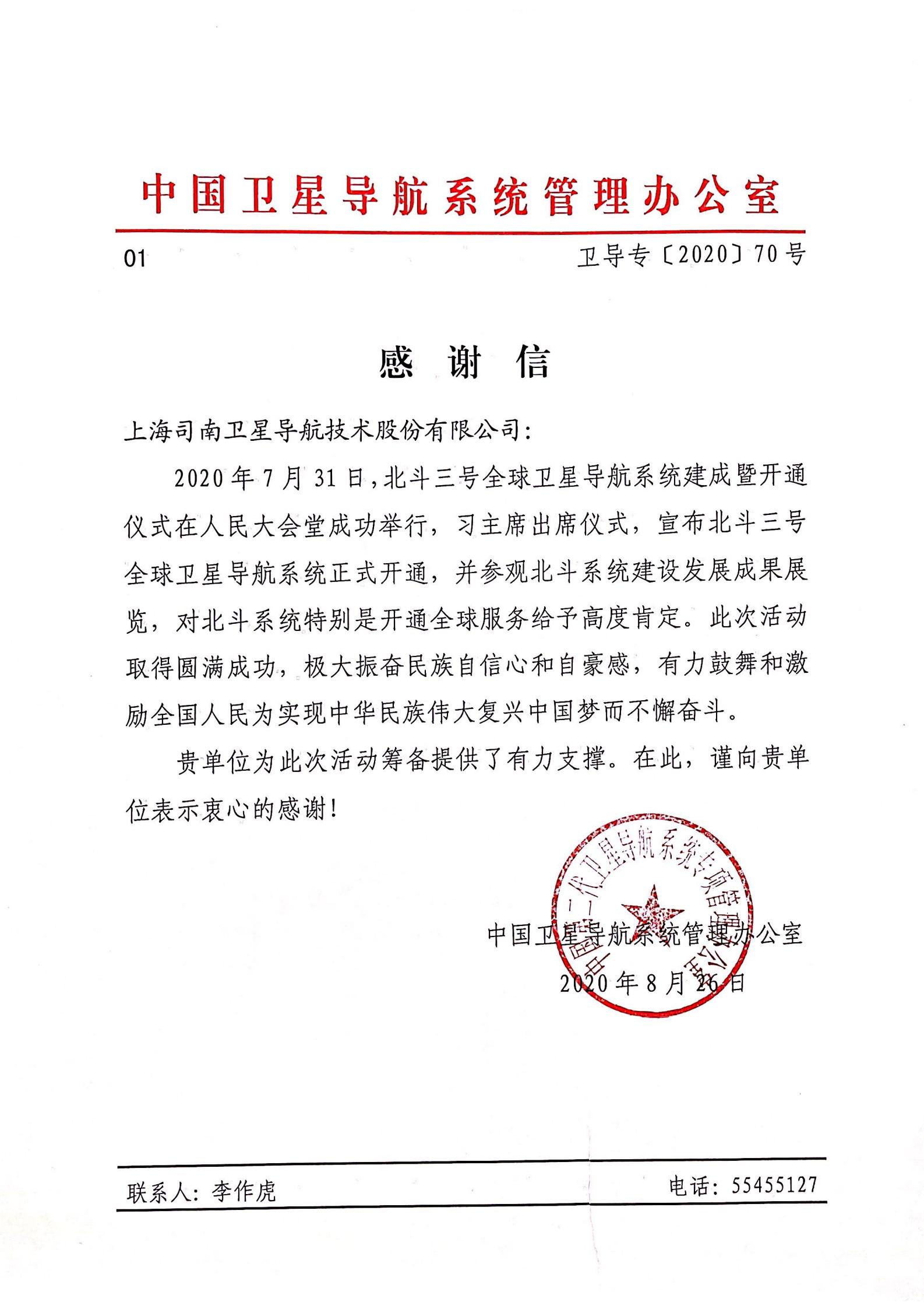 2017年08月中俄“一带一路”发来感谢信,司南导航再获肯定。