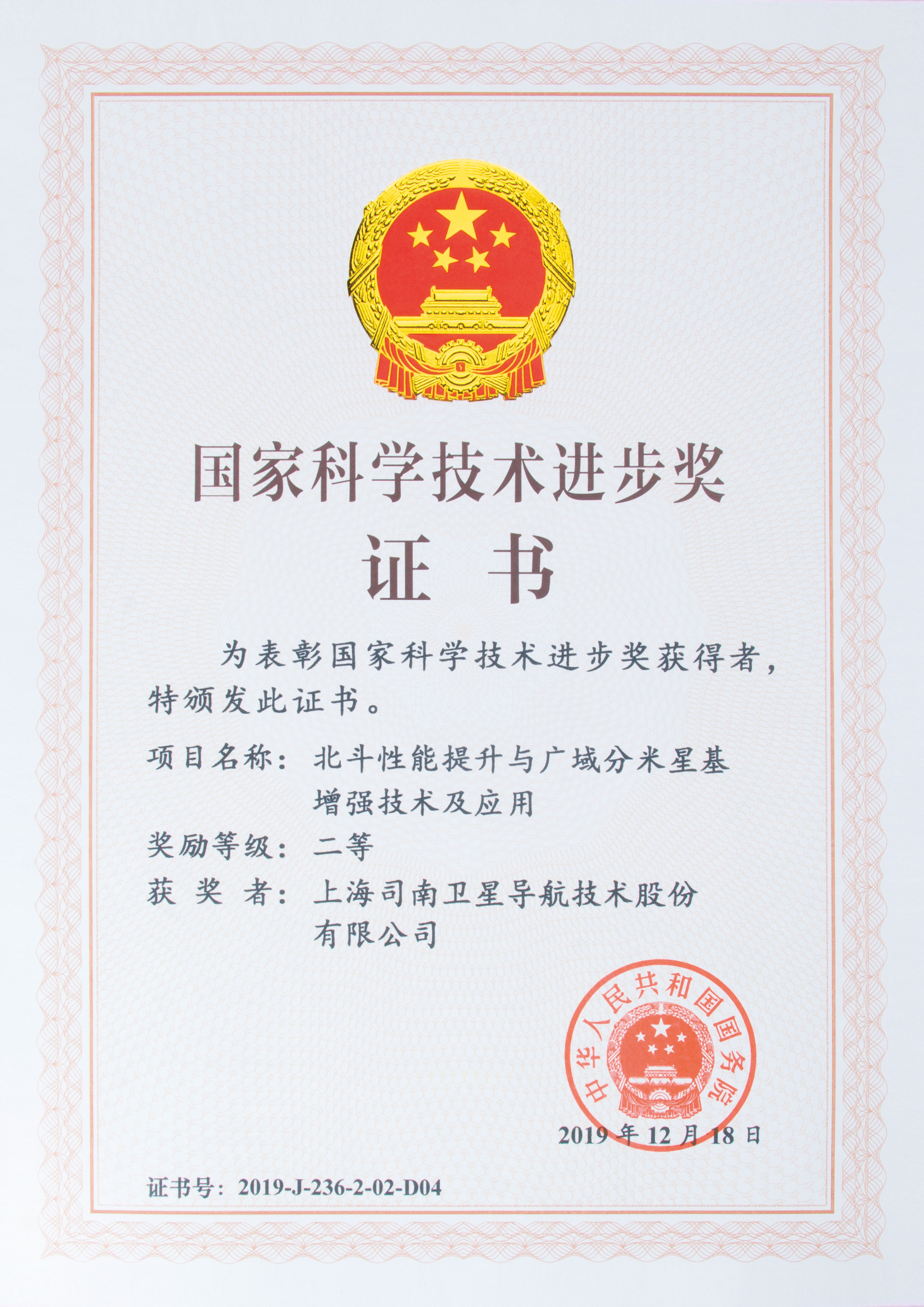 2020年01月司南导航荣获2019年度国家科学进步奖二等奖。